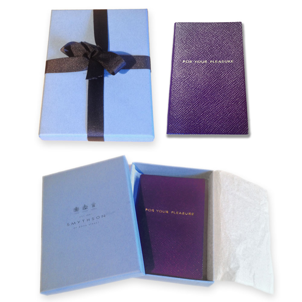 This purple grained leather covered notebook has a gold embossed ‘For Your Pleasure’ centre front slogan and trademark Smythson blue lined featherweight paper with gold gilded edges, wrapped in a tissue-lined blue Smythson box.