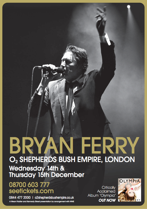 Bryan Ferry will perform two nights at London’s O2 Shepherd’s Bush Empire on Wednesday the 14th and Thursday the 15th December, 2011.